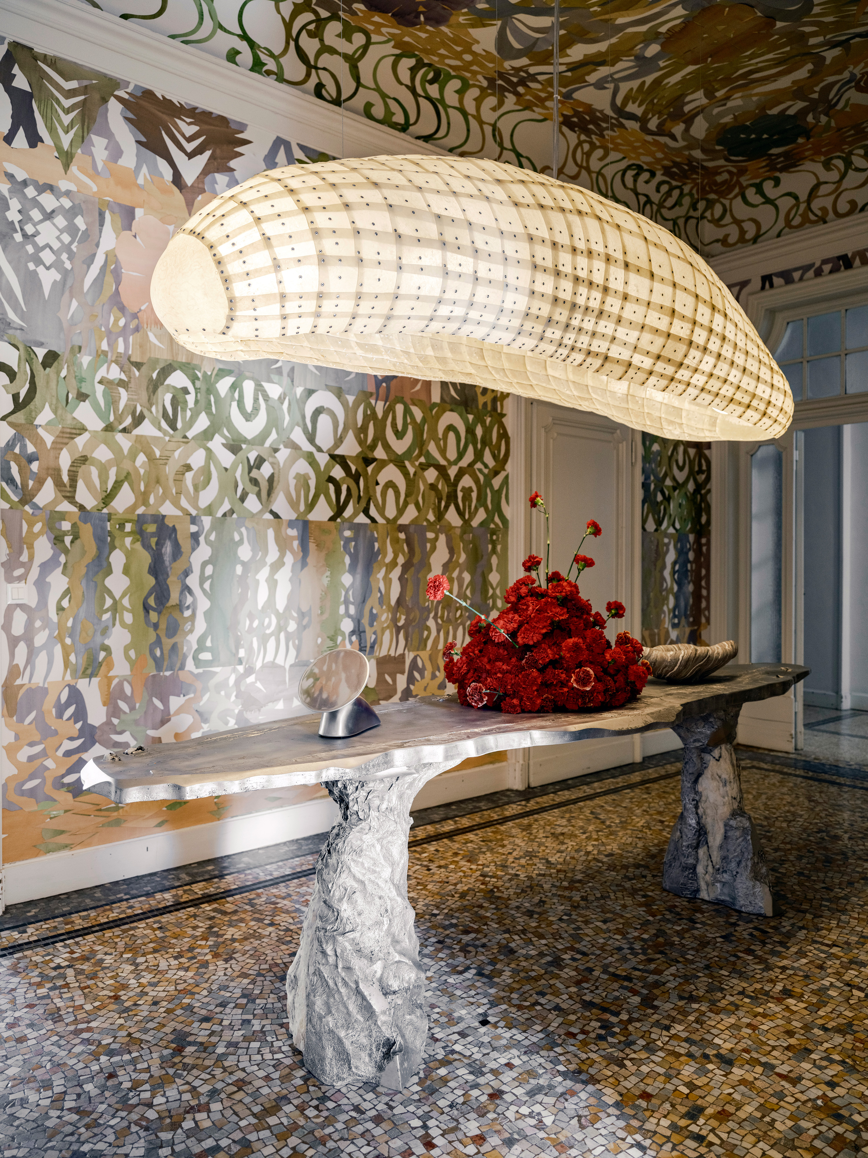 A long, flowing surface cast from recycled aluminum reflects the movement of water, with moonstones embedded like scattered river stones. The solid marble legs, veined with black, transition into cast aluminum forms that feel like a continuation of the stone.